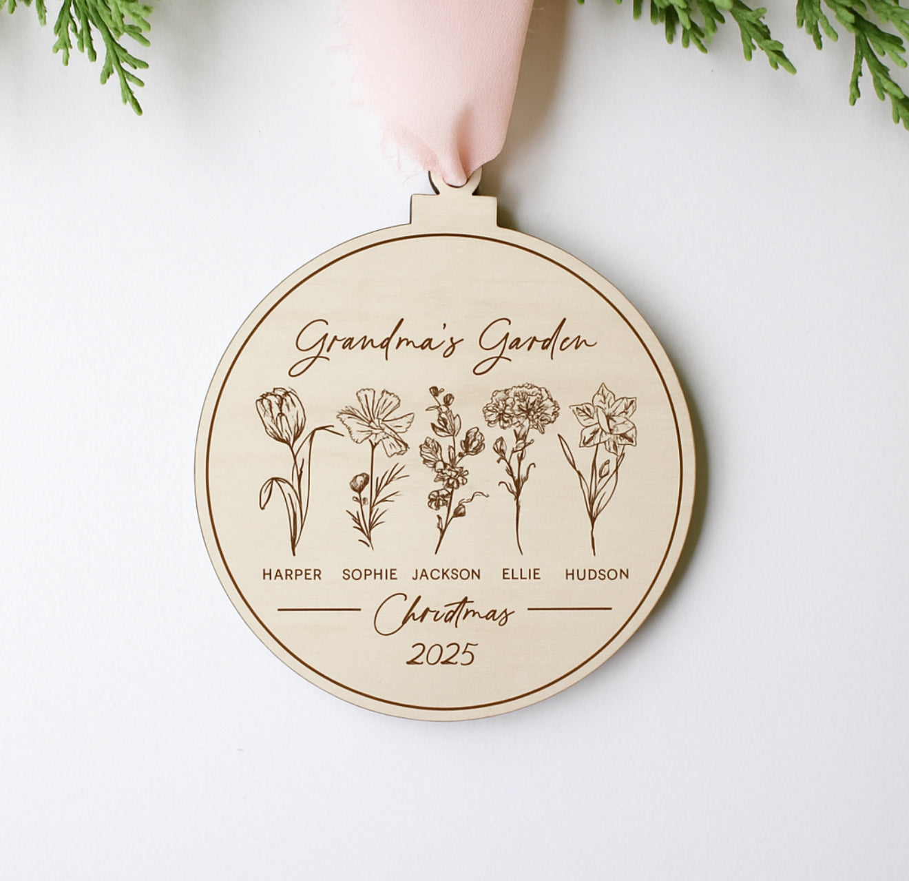Introducing our Grandma’s Garden engraved birth-month flower ornaments — a keepsake as timeless as her love. Each flower represents a grandchild, blooming together in one beautiful garden. The sweetest gift for the woman who grows love wherever she goes. Please make sure to add how many grandchildren you want to add to the ornament in the personalization box.
