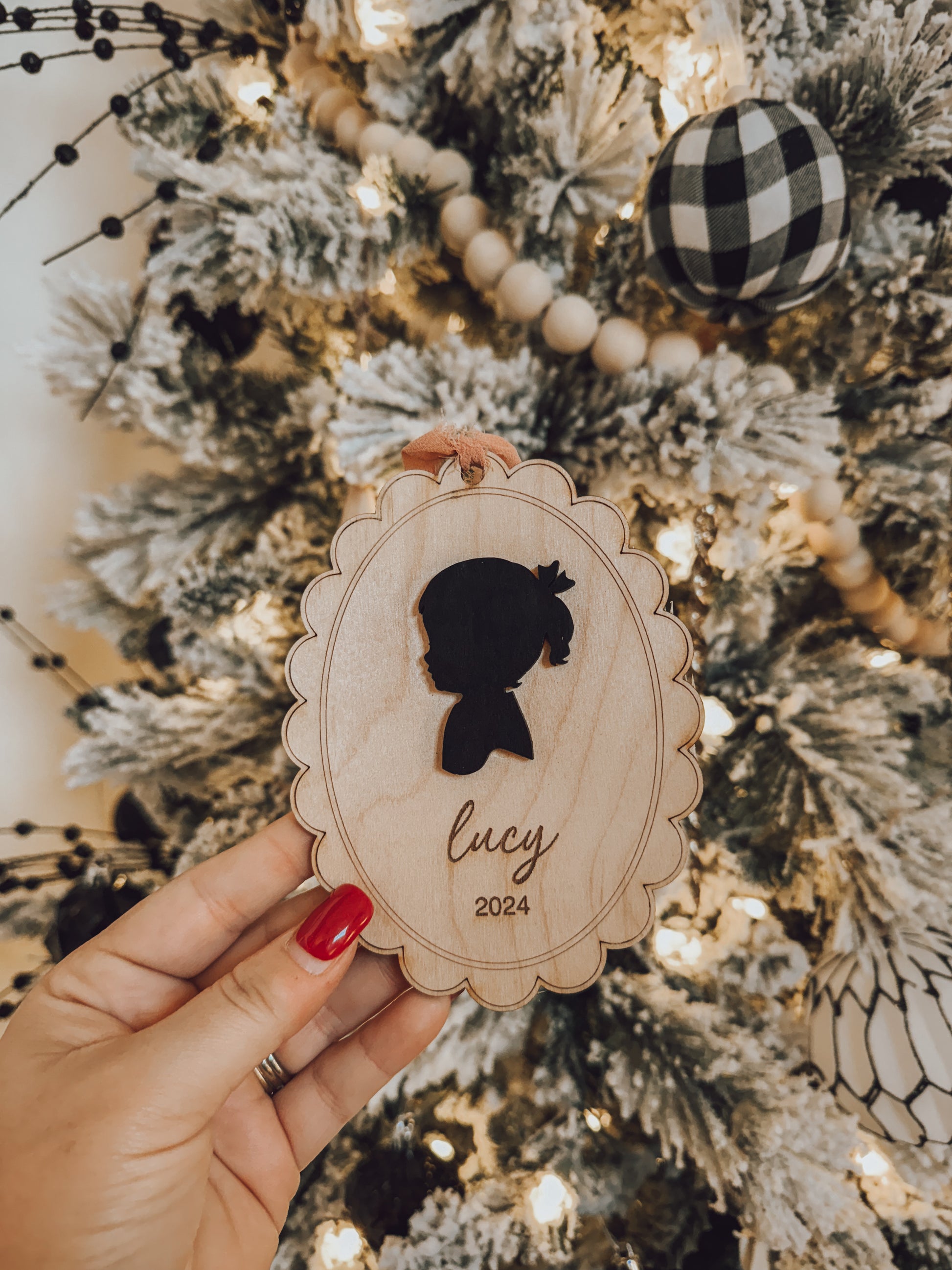 Capture your child's precious profile this Christmas to remember for years to come! Each silhouette is hand drawn and digitized, laser cut, painted, and layered onto an oval wood background. Name and year are engraved underneath, and the ornament is finished with a cheesecloth of your desired color.